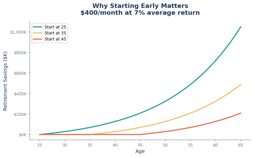 First, calculate your retirement savings target. Experts recommend having 10-12 times your current income saved by the time you retire. So if you make $60,000 per year, you’ll want $600,000 to $720,000 in your 401(k), IRA, and other accounts. Don’t worry if that sounds daunting – the key is to start saving consistently and let compounding do the heavy lifting.